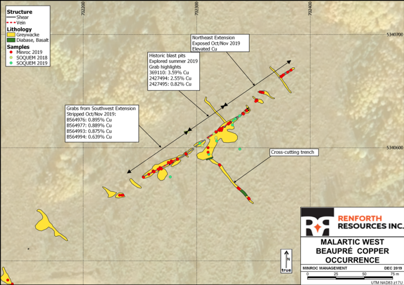 Beaupré was discovered near a lumber road in the NE part of the Surimeau property by SOQUEM, who obtained an 8% Cu grab sample, which Renforth verified with a 3.59% grab sample. Grab samples are specific and preferentially selected, therefore not representative of the entirety of the vein-hosted mineralization, which occurs as vein hosted copper mineralization in chalcopyrite and bornite over 165m on surface, where it disappears into overburden. The Beaupré discovery is a greenfield discovery, located close to the regional Cadillac Break structure, with no historical record or geophysical signature in available surveys, however, there is evidence of very old blasting activity. Renforth will wash the exposed shear zone and remove overburden along strike and in a crosscut to better characterize what Beaupré is, and identify parallel veins, if any, that occur within the stripped crosscut.