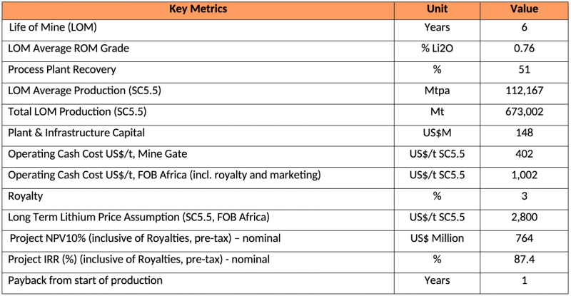Key metrics are shown below in Table 6 for the Manono PEA assumes a weighted average lithium concentrate price of $2,800 USD/t FOB Africa, based on Fastmarkets average forecast price from 2025-2026 and adjusted for a 5.5% Li2O spodumene concentrate (SC 5.5) product.