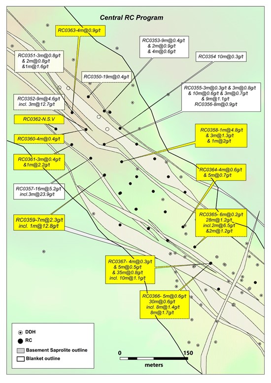 - Notable drill intercepts from the ten RC holes delineating the Central gold-in oxide blanket and basement saprolite include RC365 which returned 28m @ 1.2 g/t gold from 29m depth in saprolite, including 2m @ 6.5 g/t gold