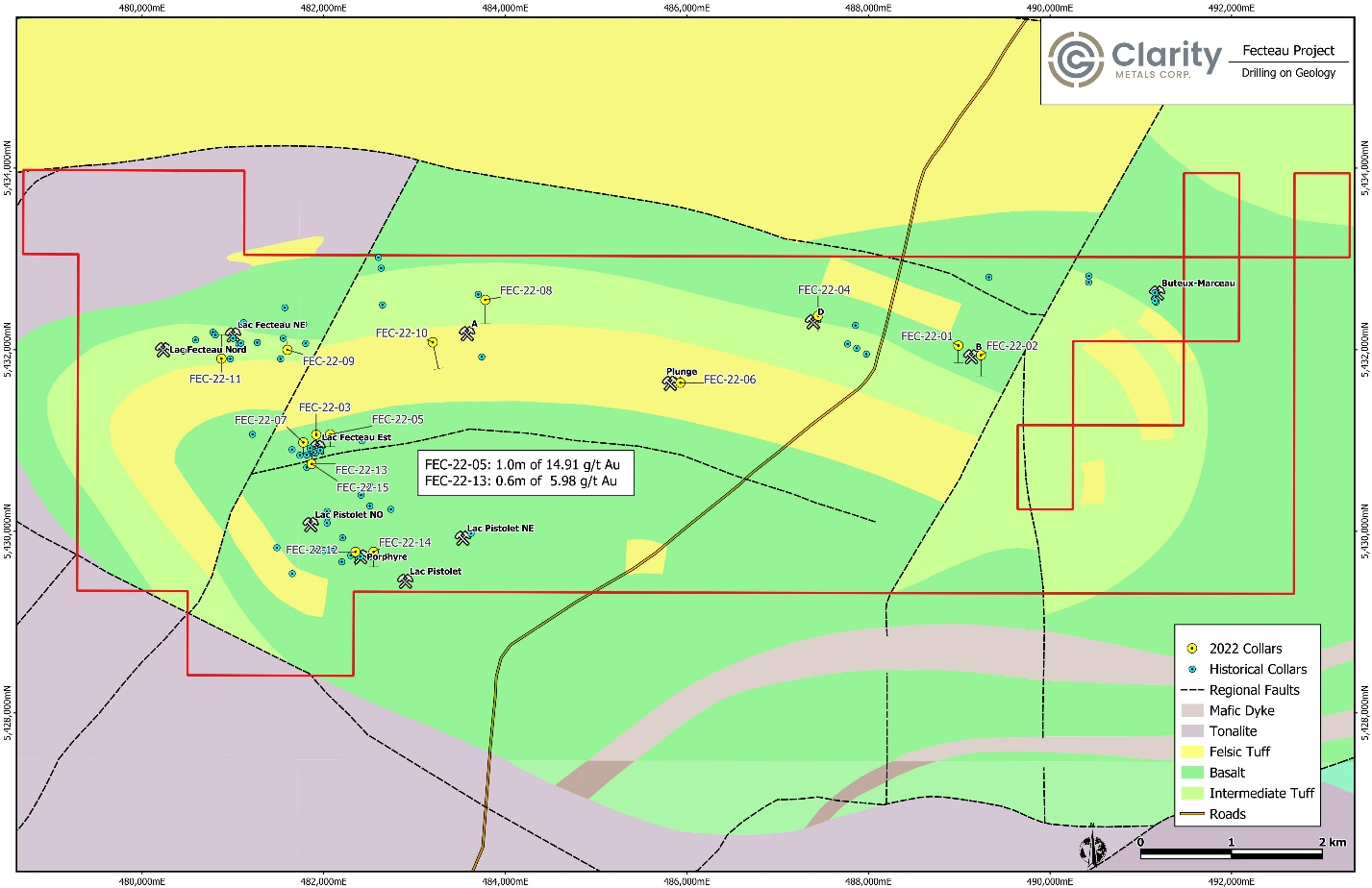 James Rogers CEO of Clarity comments “We are excited about the exploration upside of the Fecteau Gold Project. We have confirmed mineralization in structures. The project is well situated in an exciting area adjacent to Osisko’s Windfall Lake Project which published its maiden resource earlier this year.”