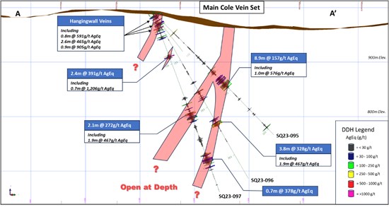 A 1.0 metre (est. TT) interval averaging 1.0/t Au, 287g/t Ag, 0.3% Cu, 0.5% Pb and 4.0% Zn (7.0g/t AuEq or 576g/t AgEq) within an 8.9 metre (est. TT) interval averaging 0.3g/t Au, 66g/t Ag, 0.1% Cu, 0.3% Pb and 1.2% Zn (1.9g/t AuEq or 157g/t AgEq) from the Cole Vein in drillhole SQ23-095;
