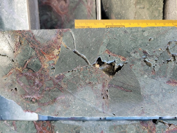 - Exploration diamond drilling completed at Drudrusavu Prospect, located within the Qiriyaga Hill Prospect area, identified a new and separate epithermal gold system characterized by two stages of quartz-sulphide mineralization with anhedral and open-space (comb) textures within silica-chlorite altered polymictic breccia and dacite. Drudrusavu is associated with a large CSAMT resistivity high target (labelled target 5 in Figure 1). A total of 87 m of alteration and quartz veining was intersected in three zones in KGD-2023-08 and 65 m was intersected in three zones in KGD-2023-09. This new epithermal gold discovery warrants testing and follow up work along strike and at depth. See photos 1 and 2. (See press release: Vatu Aurum Exploration Update 27 September 2023
