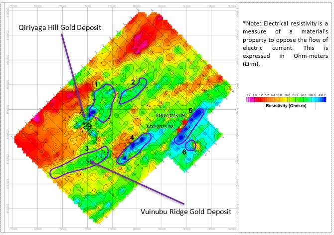 - A Controlled-Source Audio-frequency Magnetotellurics (“CSAMT”) geophysical survey consisting of 57.6-line km covering 12.5 km2 over Qiriyaga Hill Prospect, which includes Drudrusavu, was completed, including coverage of the epithermal gold mineralization of the Qiriyaga Hill and Vuinubu Ridge Gold Deposits. A detailed interpretation of the CSAMT results defined six priority target areas with high resistivity associated with known surface gold mineralization. See Figure 1. (See press release: Vatu Aurum Exploration Update 21 September 2023