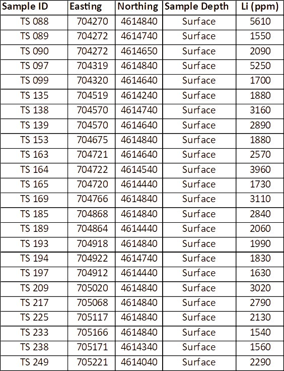 There are 6 soil samples with Li grades over 3,000 ppm.