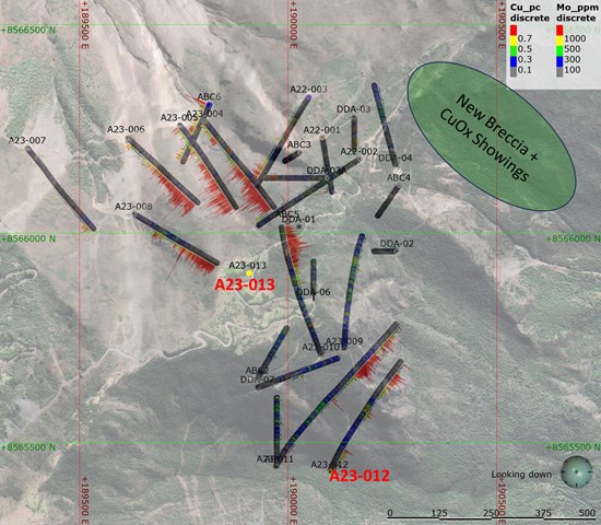 Note: *Copper equivalent grades (CuEq) are for comparative purposes only. Mo, Cu and Ag values are uncut, and core recovery is assumed to be 100% for the entire drilled lengths of A23-01 to A23-012. The project is at an early stage of exploration and conceptual recoveries of Cu 85%, Mo 82%, and Ag 75% are assigned to the CuEq calculations. Conversion of metals to an equivalent copper grade based on these metal prices is relative to the copper price per unit mass factored by conceptual recoveries for those metals normalized to the conceptualized copper recovery. The metal equivalencies for each metal are added to the copper grade. The formula for this is: CuEq % = Cu% + (Mo% * (Mo recovery / Cu recovery) * (Mo $ per lb / Cu $ per lb) + (Ag g/t * (Ag recovery / Cu recovery) * (Ag $ per oz/ 31.1034768) / (Cu $ per lb* 22.04623)).