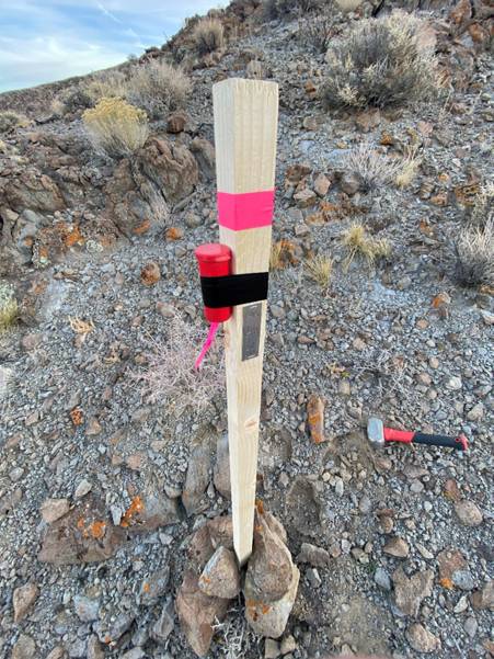Figure 3: One of the new claim posts being positioned at Garfield (Note all claims in Nevada must be physically staked out, requiring operational teams to mobilise to the field to secure new ground).