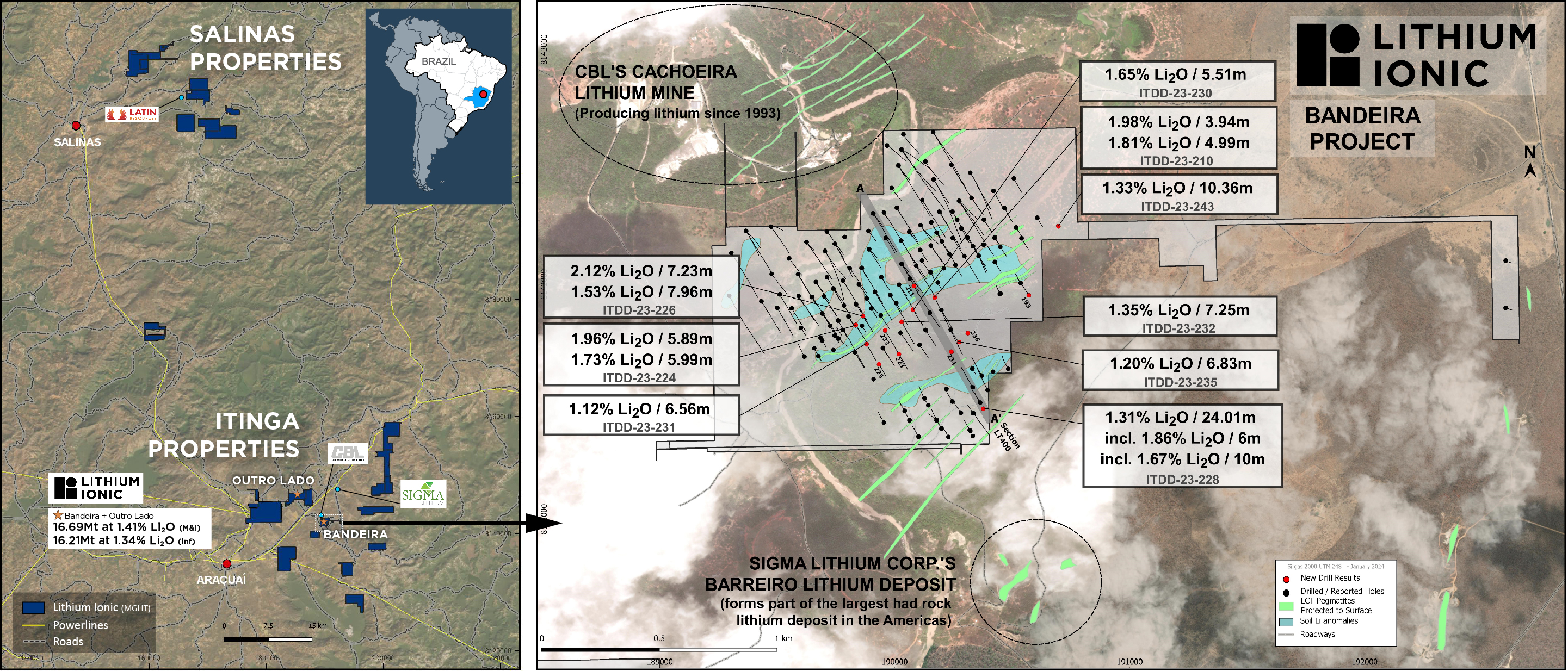 TORONTO, Jan. 23, 2024 (GLOBE NEWSWIRE) — Lithium Ionic Corp. (TSXV: LTH; OTCQX: LTHCF; FSE: H3N) (“Lithium Ionic” or the “Company”) is pleased to report new assay results for 16 drill holes from its Feasibility-stage Bandeira Lithium Project (“Bandeira”), situated in northern Minas Gerais State, Brazil, in a world-class hard rock lithium district known as the “Lithium Valley”, where two lithium producers currently operate (see location map and drill highlights in Figure 1). These results were completed as part of the 50,000-metre drill program completed in H2 2023 at its Itinga and Salinas group of properties. Drilling is ongoing at Bandeira, as well as other high priority regional targets as part of an expanded ~50,000-metre drill program planned for 2024.
