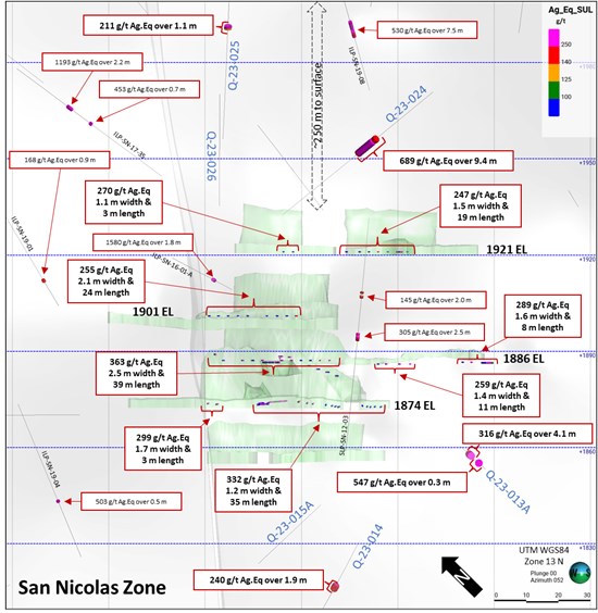 Hole Q-23-024 intersected the San Nicolas Zone returning 689 g/t Ag.Eq1 over 9.39 metres (“m”) including 1,000 g/t Ag.Eq over 5.25 m from a breccia zone which can be traced 235 m toward the surface, where a 25 m deep artisanal shaft is located.