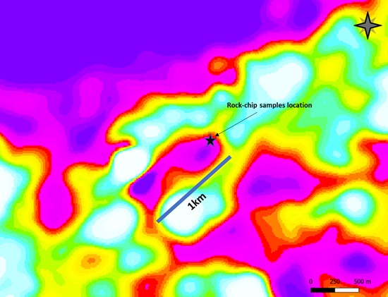 Photo 4: Airborne EM CP-880 map showing an >1km long EM anomaly below surface, with the four rock-chip samples D125049 – 052 location shown with a black star, sampling the far NE end of the anomaly.