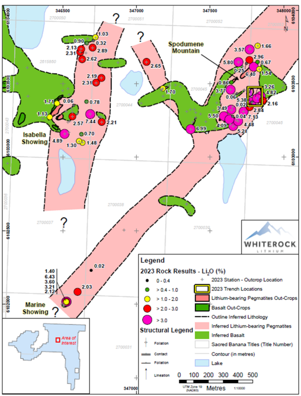 WhiteRock Lithium confirms the exposure of lithium-rich pegmatite at Spodumene Mountain has been expanded by more than 1 kilometre to the west and 2 kilometres to the southwest