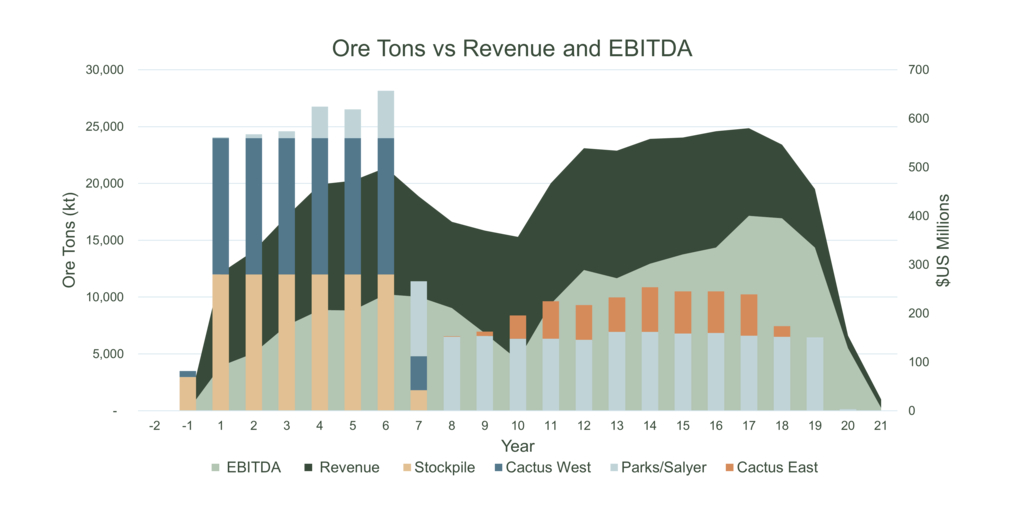 The Cactus Mine plan includes production from four separate mining areas: Cactus West Open Pit, Historical Stockpile, Cactus East Underground, and Parks/Salyer Underground. Ore processing in the mine schedules involves oxides and secondary sulphides being processed on a heap leach after multi-stage crushing.