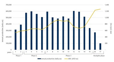 The Company expects to produce gold and silver doré. Gold equivalent ounces have been determined using a gold:silver ratio of 78:1 (or US$1,800:US$23) |