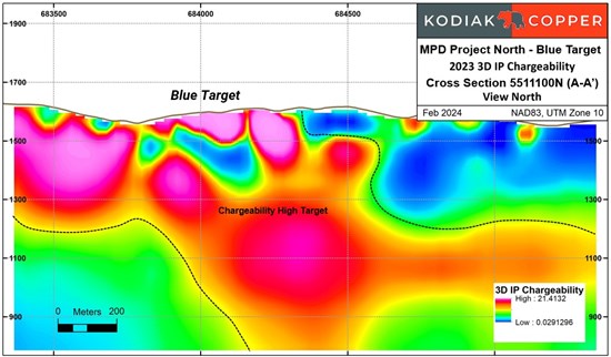 - Much like other successful copper porphyry discoveries by Kodiak at MPD, the 3D-IP response at the Blue Target coincides with the north end of a two-kilometre-long copper-in soil trend and significant prospecting results (see news release February 3, 2022).