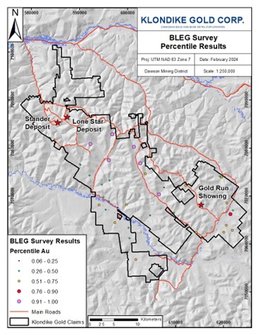 No samples in the BLEG survey were collected within 10km of the northwestern end of the property thus excluding the highly prospective drainages of Eldorado and Bonanza Creeks where the Company has outlined the open ended Lone Star and Stander Deposits both with open pit constrained Mineral Resource Estimate (“MRE”)1 areas.