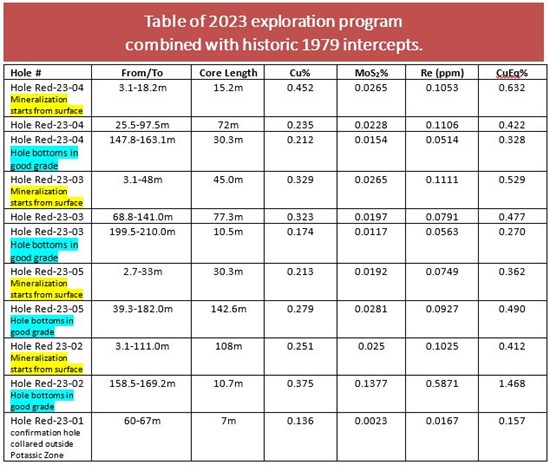 Table of 2023 exploration program combined with historic 1979 intercepts.