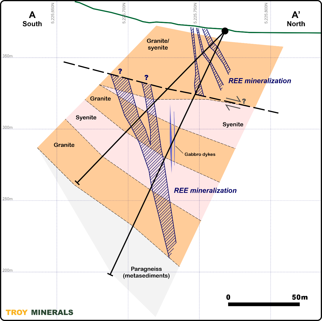 Drill holes LJ-23-01 and -02 intersected multiple zones of anomalous REE mineralization associated with pegmatitic syenite to granite intrusives. In the upper 50 metres, mineralization appears as several narrow, steeply dipping zones (Figure 3) At depth, similarly steeply-dipping, wider zone(s) of mineralization are noted in both drill holes. A major low angle fault is noted in both drill holes and suggests a possible lateral offset of some 50 metres of the upper and lower mineralization. A major mapped regional fault passes through this area (Figure 2) and the encountered downhole fault is likely this same fault, or a possible splay structure.