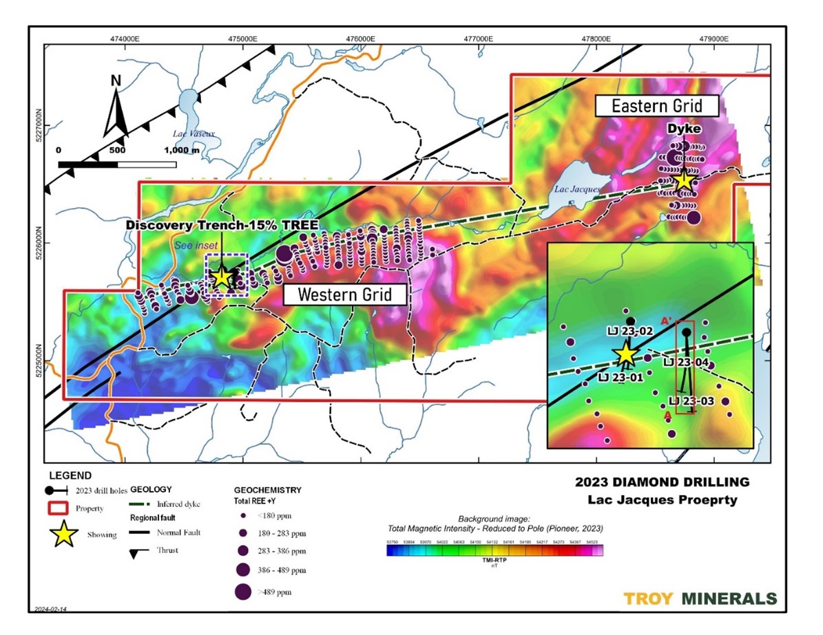 VANCOUVER, BC / ACCESSWIRE / February 20, 2024 / TroyMinerals Inc. (“Troy” or the “Company“) (CSE:TROY)(OTCQB:TROYF)(FSE:VJ3) is pleased to announce results from the final two drill holes completed in Fall of 2023 at the Lac Jacques rare earth element (REE) property. The 100% owned Lac Jacques property is located approximately 250km north of Montreal Quebec, Canada and approximately 40km northeast of the town of St. Anne du Lac (Figure 1).