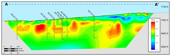 Figure 2. Inverted Resistivity Profile from A-A’. ERT data from 2023 at the Agate Site. Resistors (red/yellow) colors represent the sandstone interval hosting the uranium roll front deposit. AG-16-23 is interpreted to be near the nose of the uranium roll front. ERT assists with identifying the roll front sand unit but gives less direct information about the chemical reactivity of the redox condition at the roll-front. This research is encouraged by initial Induced Polarization (IP) testing near and within these boreholes to provide information about the chemical reactivity of the roll front.