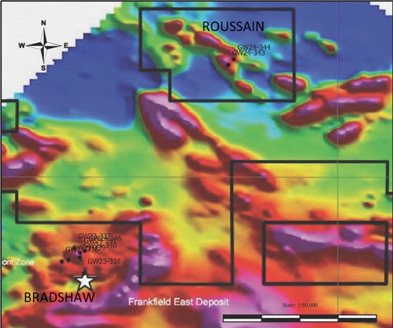 Phase 2 consists of a total of 16,500 m of planned drilling aimed at testing and expanding the known gold mineralization within the Bradshaw Gold deposit, as well as in other parts of the NTGP area with notable historical gold intercepts in prospective gold mineralization zones, particularly in the Roussain and Sheridan zones.