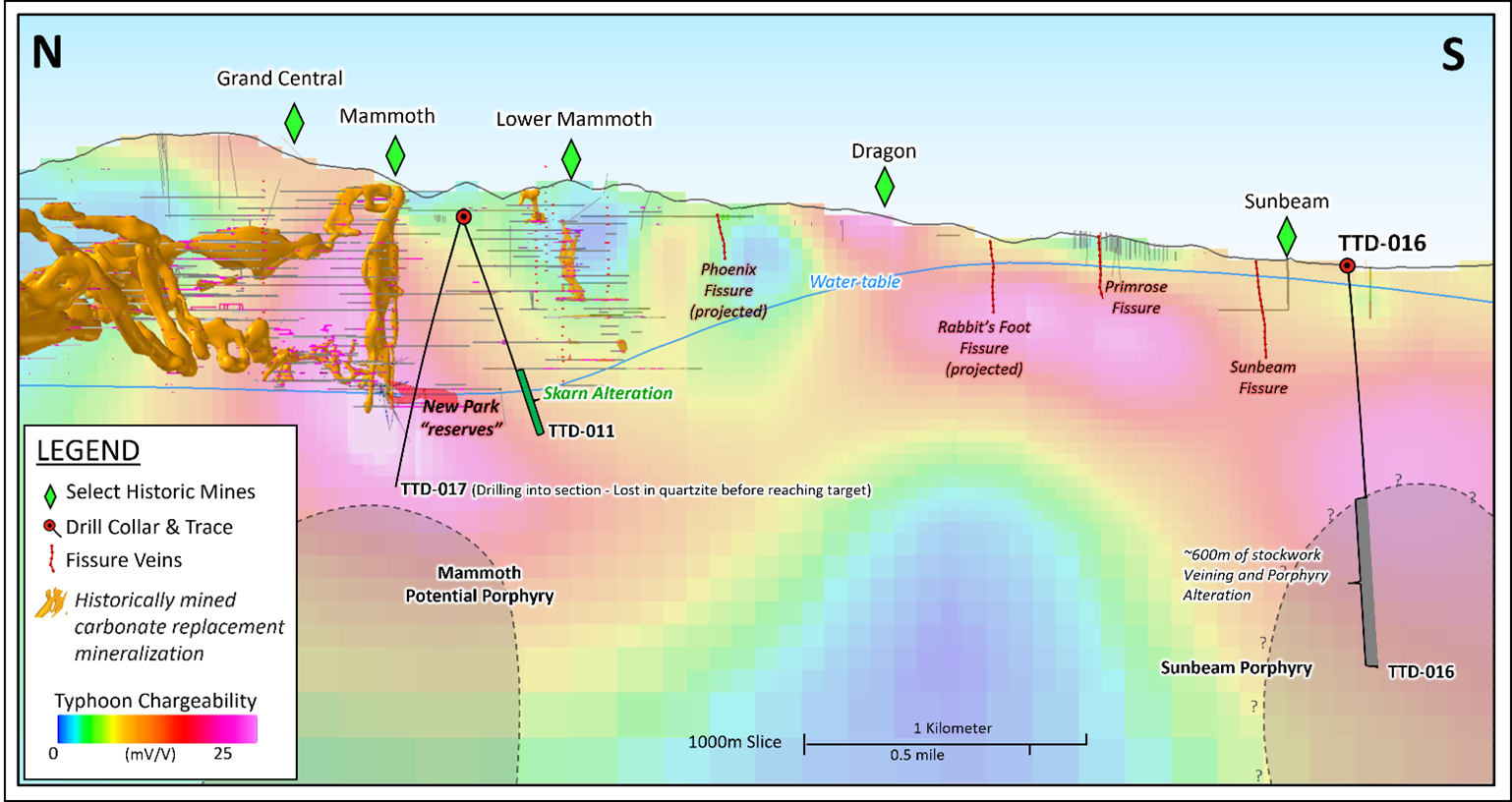 Figure 1. North-South cross section from Mammoth-Grand Central through to the Silver City & Sunbeam areas. Relevant drilling over the updated Typhoon™ chargeability inversion with historical mine development and potential extensions beneath the water table.