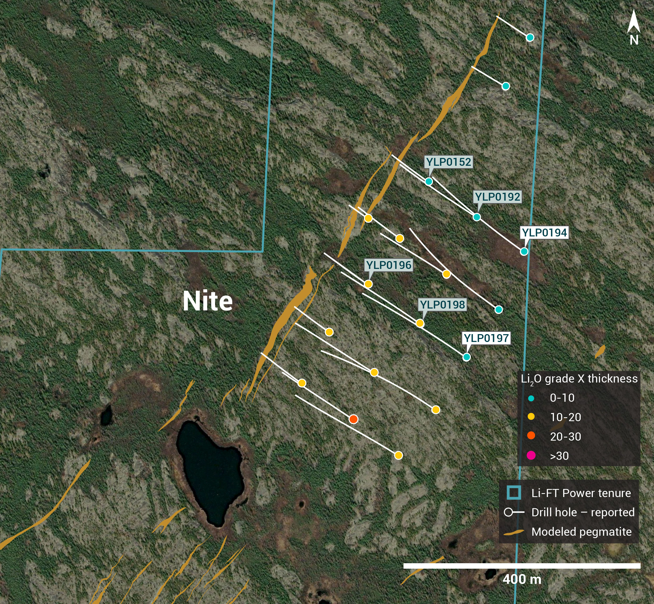YLP-0194 was drilled to test the main pegmatite at 400 m from its northern mapped extent and 200-225 m below the surface. Previous drilling on the same section returned 1.24% Li2O over 5 m from 50 m depth (YLP-0152) and 0.87% Li2O over 6 m from 150 m (YLP-0192). New drilling intersected a 20 m wide corridor with 13 m of pegmatite that returned negligible grade.