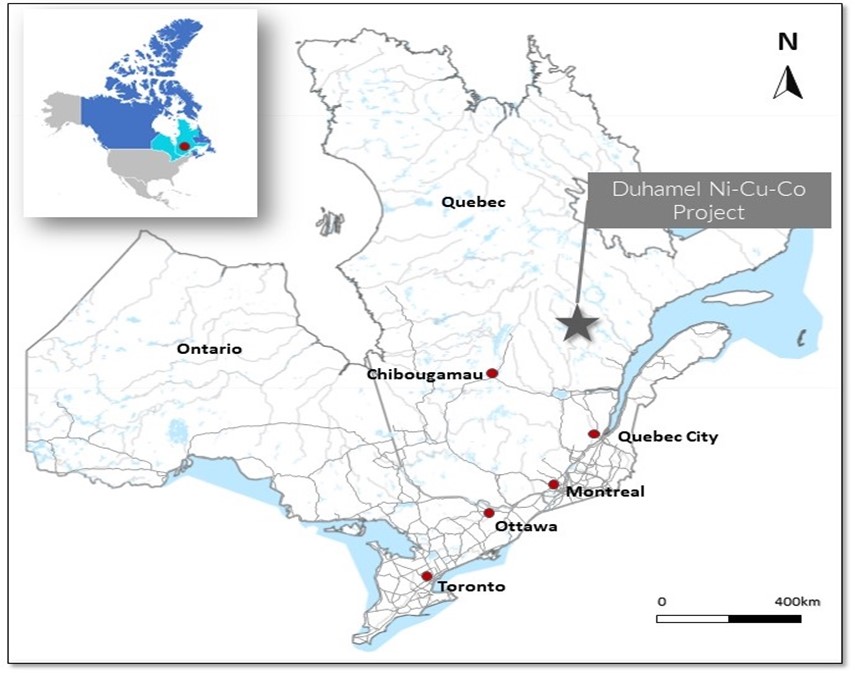 - Quebec (Duhamel – Ni-Cu-Co prospect & Titanium, Vanadium, and Chromium Prospect)