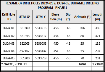 Phase 1 drilling consisted of 5 holes totaling 1,218m ( table 1 ), which targeted numerous priority airborne and ground EM conductors within the Houlière block (figure 2 ). Historical work within the Property and surrounding areas have shown these conductors are the primary target horizons.