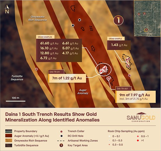 Sanu Gold Announces Additional High-Grade Gold Results from the Daina Exploration Permit in Guinea, West Africa: 9 m of 7.97 g/t Au Trench Sampling and 61.6 g/t Au from Rock Chip Sampling