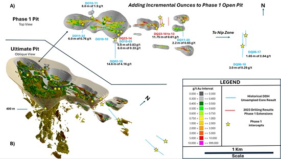DQ10-11 and DQ11-22 revealed the potential to add incremental ounces to the main portion of the Phase 1 pit shell with 8.0 m of 1.9 g/t Au and 6.0 m of 0.76 g/t Au this is expected to extend the footprint of mineralization and add additional lower grade incremental ounces to the high-grade zones in the Phase 1 Open Pit.