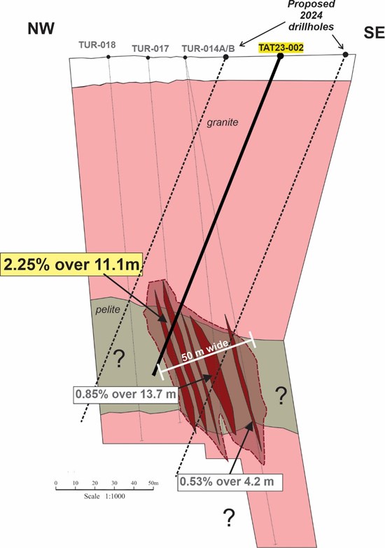 Figure 2 The Tatiggaq Main and West zones are interpreted to be a series of near vertical, uranium- bearing lenses that trend for 1.5 km. The width of the mineralized section is interpreted to be approximately 50 m but its total width is not yet determined. TAT23-002 only intersected two of these lenses that were intersected in near vertical holes by Cameco’s previous drilling (for example 0.85% over 13.7m in hole TUR14A). Proposed future drill holes will target mineralization to intersect the true width of the zone and its strike extent.