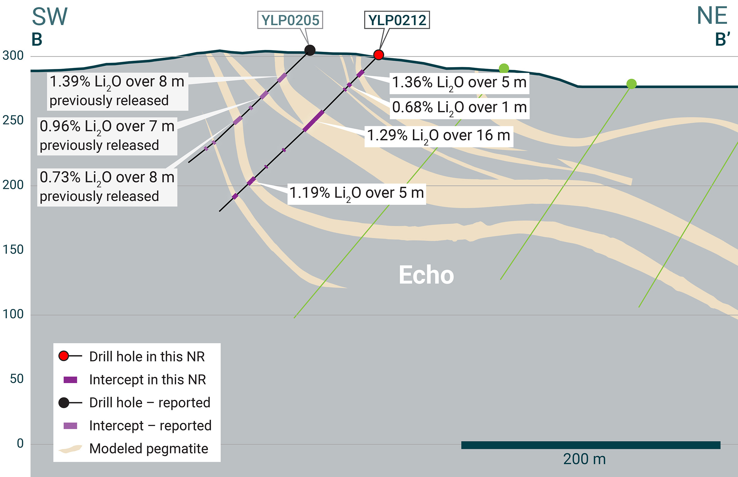 including: 24 m at 1.33% Li2O - YLP-0212: 16 m at 1.29% Li2O, (Echo)