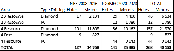 Resource infill drilling was completed in November 2023 which brought total drilling for Area 2B and Area 4 to 268 holes with a total of 40,153 m of both, diamond core drilling (DC) and reverse circulation drilling (RC), see table below: