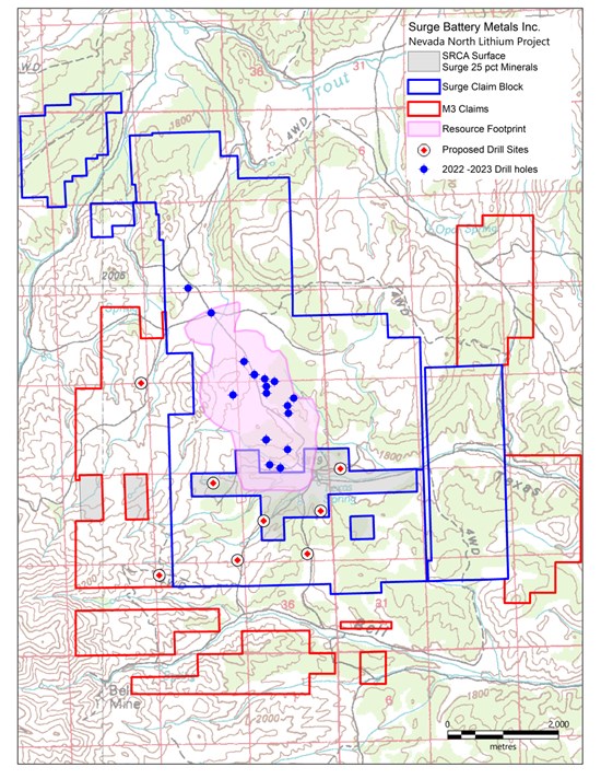 Surge Battery intends to drill four holes on claims held by Surge Battery as well as claims with its joint venture partner M3 Metals. The drill sites shown in the figure below are tentative with the actual locations to be determined by ground conditions, avoidance of sensitive areas on the private parcels and permitting approval by the Bureau of Land Management on the M3 and Surge Battery claims.