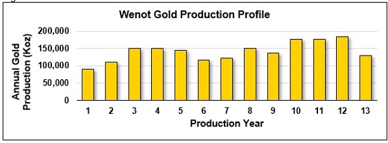 Annual production over the life-of-mine from the Wenot pit is expected to average 142,000 ounces of gold with a peak year production of 184,000 ounces, for total payable gold production of 1,840,000 ounces.