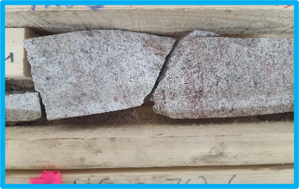 CF24-002 was drilled targeting a conductive anomaly along the eastern edge of a gravity low anomaly. The drill hole was successful in encountering anomalous radioactivity in the Athabasca Sandstone just above the unconformity as well as a second interval of anomalous radioactivity located 1.6 m into the basement. Anomalous radioactivity was encountered in the Athabasca Sandstone with a radioactive peak of 1,540 CPS in a 4.2 m interval that averaged 358 cps, including 0.3 m at 1,322 cps. The radioactivity is associated with hematite, chlorite and clay alteration and stockwork fracturing (Figure 1-4). A RS-230 BGO Super-SPEC Handheld Gamma-Ray Spectrometer measured radioactivity of 520 counts per second (“cps”) and a Mount Sopris 2PGA-1000 downhole gamma probe measured a radiometric peak of 1,540 cps within a 4.2 metre interval of anomalous radioactivity from 758.5 to 762.7 metres. The unconformity was intersected at 762.6 m, which is significantly shallower than expected and is similar depth to unconformity as Orano’s and UEC’s (Uranium Energy Corp.) Shea Creek deposits 13km to the west. The second interval of anomalous radioactivity was encountered 1.6 m below the unconformity in hematite altered basement rocks from 764.2 to 768.2 m averaging 145 cps with a radioactive peak of 262 cps measured with the downhole gamma probe. The alteration both above and below the unconformity indicating the fertility of the target area and a mineralized system.