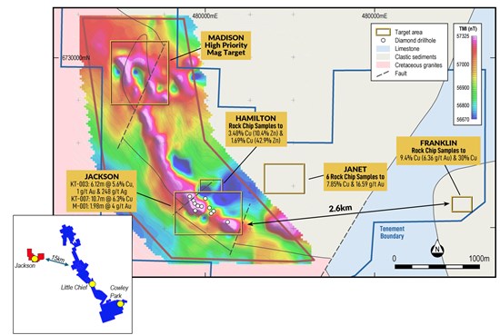 Franklin Target: Located more than 2.6km to the east of historic drilling with rock chip samples in trenching to 9.4% Cu (6.36g/t Au) and 30% Cu.