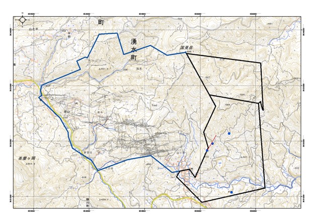 (Figure 3 – Plan map showing the outline of the Yamagano Mining Lease (blue, optioned by Irving), the outline of the western part of the East Yamagano claimblock (black), the traces of Yamagano underground mine workings (gray) and the trace of hole 23SY-001 (red).