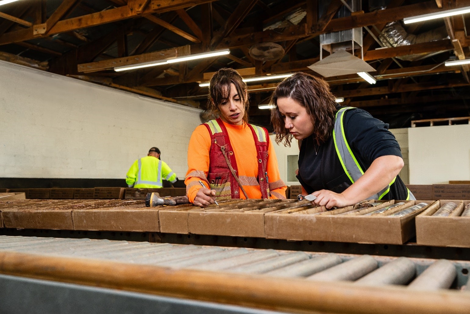 Picture 2. Geologist Sarah Bala (left) and Junior Geologist Terri Torres (right) analyzing drill core at the processing facility at the Santa Cruz Copper Project.