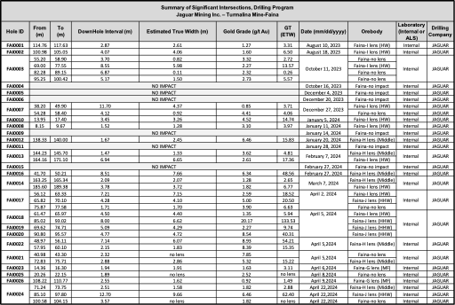 TORONTO, ON / ACCESSWIRE / May 21, 2024 / Jaguar Mining Inc. (“Jaguar” or the “Company”) (TSX:JAG)(OTCQX:JAGGF) is pleased to provide an update and announce that access development and concomitant mineral resource delineation diamond drilling has intersected high-grade mineralization at its Faina Project (“Faina“). Faina is part of the Company’s MTL Mining Complex which also includes its Turmalina Mine, and is located in the state of Minas Gerais, Brazil, approximately 130 kilometers northwest of the city of Belo Horizonte.