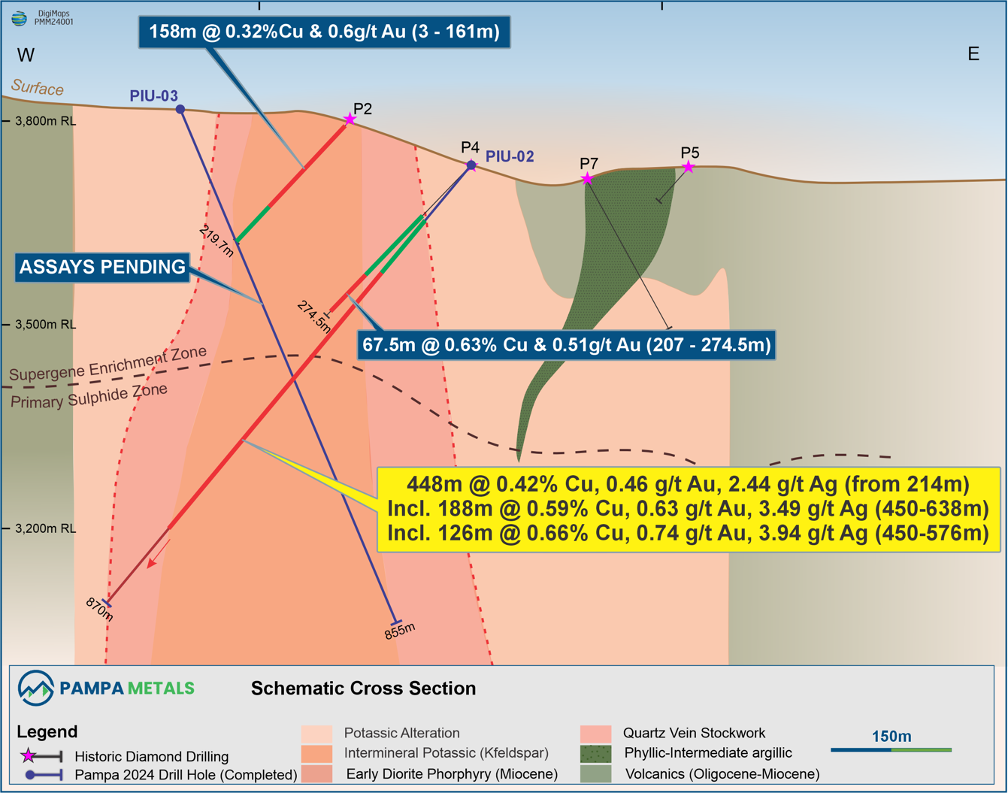 VANCOUVER, BC / ACCESSWIRE / May 6, 2024 / Pampa Metals Corp. (“Pampa Metals” or the “Company”) (CSE:PM)(FSE:FIR)(OTCQB:PMMCF) is pleased to report outstanding copper-gold assay results for diamond drillhole PIU-02 (refer figure 1) recently completed at the Company’s Piuquenes project in San Juan Province, Argentina.