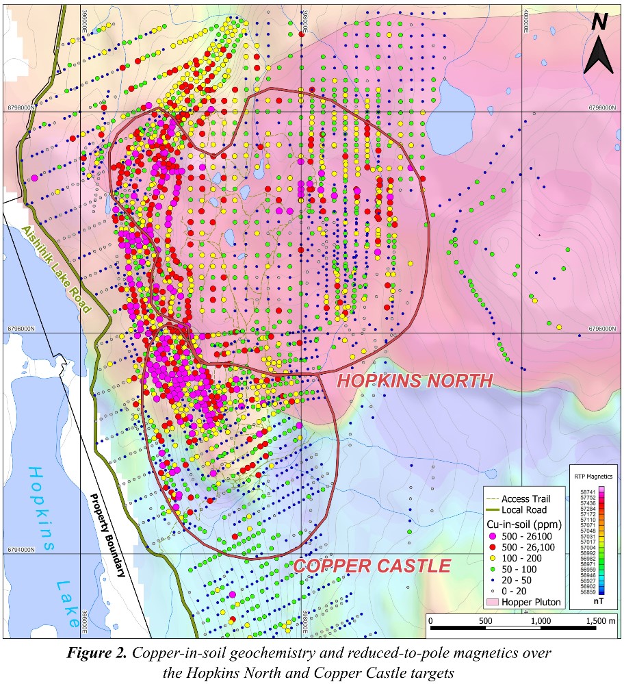 - 2022 drill results of 1.87% copper and 1.04 g/t gold over 15.27 m from the Copper Castle skarn target and 0.22% copper over 114.38 m from the Hopkins North porphyry target