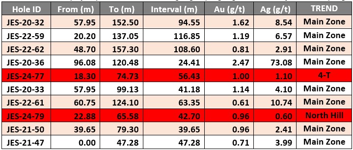 Table 1. Summary of Top Ten Tocvan Drill Highlights, highlighted red are from 2024 program.