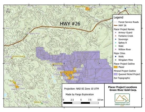 Green River holds six contiguous placer mining claims totaling 255.94 hectares straddling the Swift River, a river which has a significant history of placer mining production dating back to the Cariboo Gold Rush in the 1870’s. The Company also holds placer claims on several other creeks and rivers in the Cariboo Mining District. Several of the placer properties are already permitted and bonded. The placer properties owned by Green River are shown in Figure 1 against the backdrop of the Company’s 200 square kilometer Quesnel Nickel/Fontaine Gold mineral property.