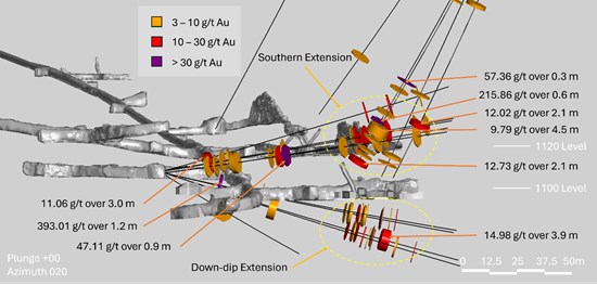 Figure 2. Zone 5 north of Cabex drilling with high-grade intersects highlighted, 3.0 g/t gold cutoff. View is to the NNW. The primary target area is the down-dip extension of the UR2 lode below the 1120 level.