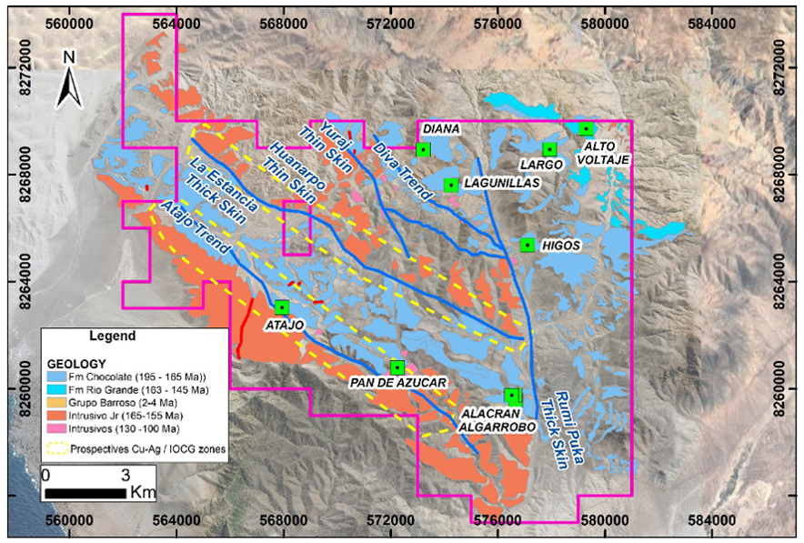 As part of the exploration program, a 1:5000 scale reconnaissance geological mapping campaign will be carried out in the area known as La Estancia (Figure 2), where the deep-seated fault is projected along a 12-kilometer corridor with the exploration objective to delimit new stratabound copper-silver and IOCG type mineralised bodies for follow-up drilling.
