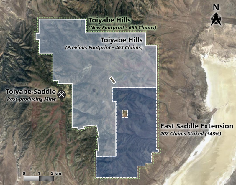 Vancouver, British Columbia, June 4, 2024 – TheNewswire – Westward Gold Inc. (CSE: WG, OTCQB: WGLIF, FSE: IM50) (“Westward” or the “Company”) is pleased to announce the acquisition of 202 unpatented mining claims, adjacent to and contiguous with its Turquoise Canyon and East Saddle Properties along the Cortez Gold Trend in Lander County, Nevada. The claims (the “ES Extension”) were acquired through open staking in April 2024, increasing the Company’s total footprint in the area to approximately 55 square kilometers, a significant increase of 43%. Westward continues to reinforce its status as the dominant exploration company in the area, and is ideally positioned to strategically apply district-scale exploration techniques to its sizeable property package. Moving forward, Westward’s consolidated flagship asset will be referred to as the Toiyabe Hills Project – the combination of several 100%-owned claim blocks acquired since the Company’s entrance into Nevada in April of 2021. Figure 1 below illustrates the systematic growth of Westward’s exploration ground, accomplished via a combination of corporate transactions and direct claim-staking.