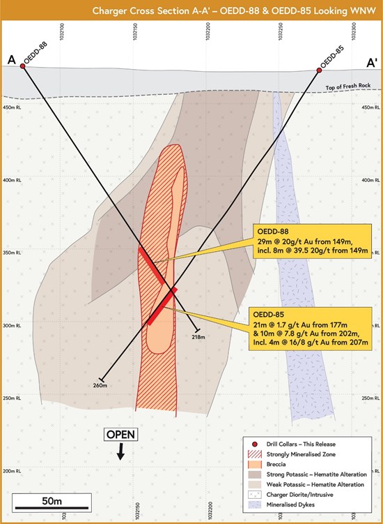 Nine holes for 2,953m (Figure 1) were drilled at Charger in two phases for this campaign, with five holes for 1,295 m reported in this release and a further four holes for 1,659 m completed at the end of the drilling program. The initial five holes were targeted around the previously reported OEDD-83 intercept. Holes drilled to the west (OEDD-84, OEDD-85 and OEDD-88) all intercepted target breccia, while the step east (OEDD-86) and the step back (OEDD-87) intercepted peripheral alteration similar to other holes drilled close to the breccia zone, suggesting the breccia mineralization plunges toward the west and south from OEDD-83. A full table of significant intercepts is shown in Table 2 below, as well as a cross section for holes OEDD-88 and OEDD-85 (Figure 2).