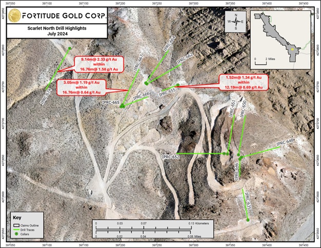 COLORADO SPRINGS, CO / ACCESSWIRE / July 30, 2024 / Fortitude Gold Corp. (OTCQB:FTCO) (the “Company”) announced multiple oxide gold drill intercepts at and near surface from the Scarlet North target along the Company’s Isabella Pearl trend. The Scarlet North target is located just 700 meters northwest of the Isabella Pearl heap leach and process facility. Intercepts include 9.14 meters grading 2.33 grams per tonne (g/t) gold within 16.76 meters grading 1.58 g/t gold. The Company also released multiple rock chip surface samples from a new, undrilled target in the Scarlet North area, the highest assaying 2.24 g/t gold. Fortitude Gold is a gold producer, developer, and explorer with operations in Nevada, U.S.A. offering investors exposure to both gold production and dividend yield.