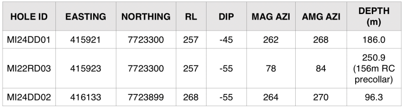 Hole MI24DD02 in the central north was drilled in difficult topography at a shallow angle to the west to test below a well-mineralised CuO-bearing siliceous breccia zone at surface and for a second intersection of the Fountain Range-Quamby Fault Zone. The hole was unable to be completed to target depth and was terminated short of adequately testing both targets.