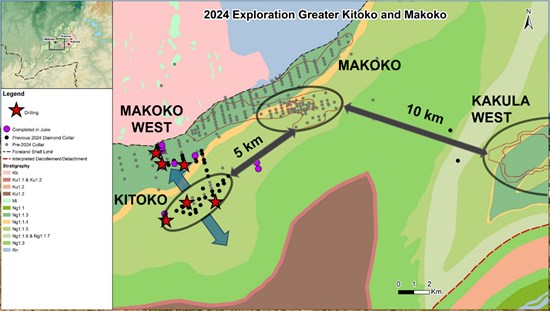 - Ivanhoe continues its expansive copper exploration program on its Western Foreland licenses adjacent to Kamoa-Kakula. The company’s 2024 exploration program consists of 70,000 metres of diamond-core drilling, with 39,000 metres completed during H1 2024. Drilling during Q2 2024 was mostly focused on Kitoko and Makoko West. Nine drill rigs were in operation at quarter end.